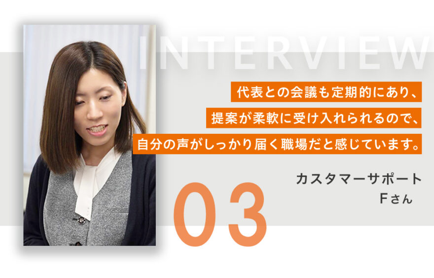 社員同士の距離が近く、意見を聞いてもらいやすい会社です。代表との会議も定期的にあり、提案が柔軟に受け入れられるので、自分の声がしっかり届く職場だと感じています。