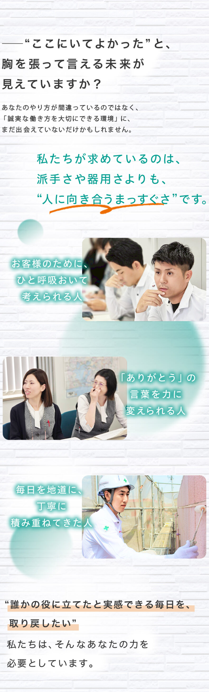 100%元請けとして、お客様に正直で正確な提案をすることが求められるからこそ、自信を持って働けます。