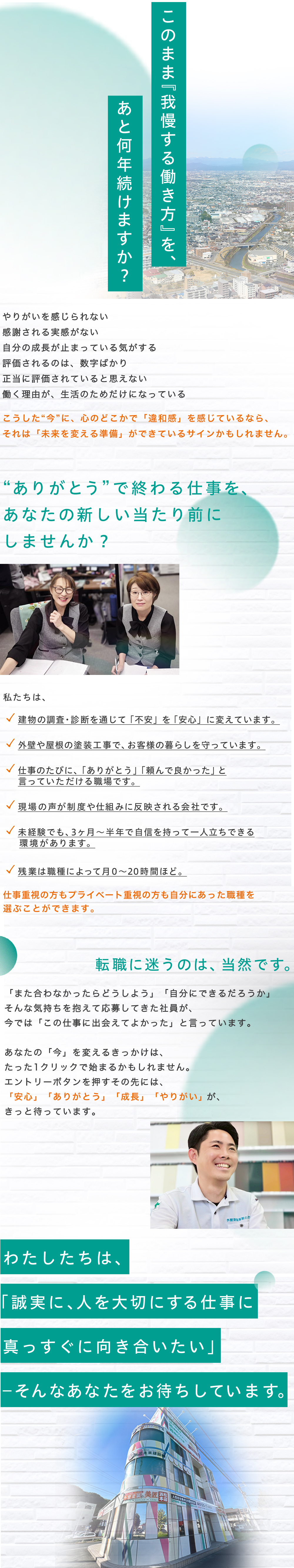 ◎ 調査・提案・契約・工事フォロー・アフターまで一貫して担当し、チームと連携しながらお客様の不安を安心に変える手応えを日々実感できます。