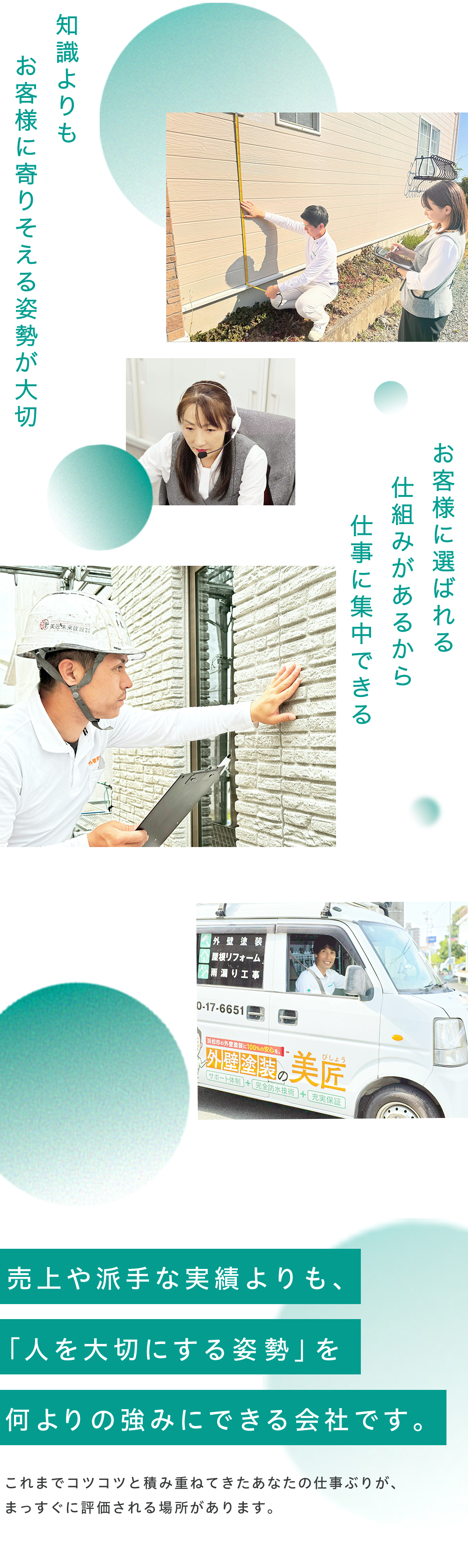 ◎ 現地診断の結果に基づき、押し売りではなく“納得”につながる提案を行い、「この人に任せてよかった」と感じてもらえる関係づくりを大切にできます。